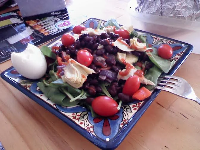 Fueling my training with healthy eating with meals like this spinach salad topped with beans, avocado, tomato, artichoke hearts, hardboiled egg, and sriracha.